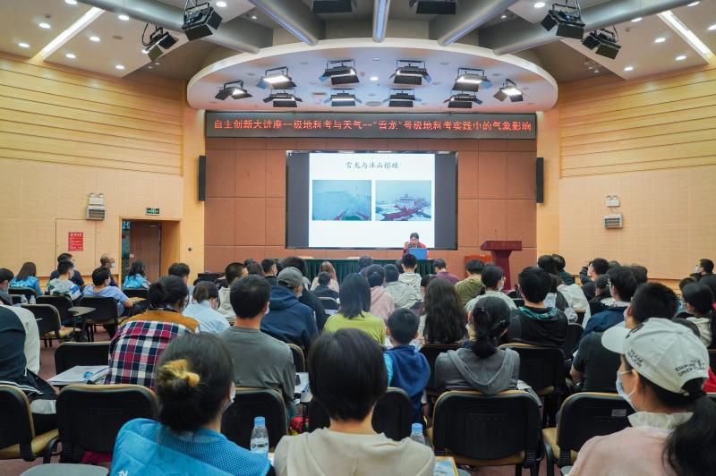 沈船長首先為大家講述了他30余年航海生涯中所經(jīng)歷的南北極復(fù)雜多變的海洋天氣對航行的影響,尤其是穿越風(fēng)力達12級、浪高8米、船體搖擺達45度的西風(fēng)帶險情;分享了在新冰和老冰堆積的浮冰上航行,在平整的冰原上開辟航路,船舶受困冰區(qū),參與解救俄羅斯遇險科考船等驚心動魄的經(jīng)歷。