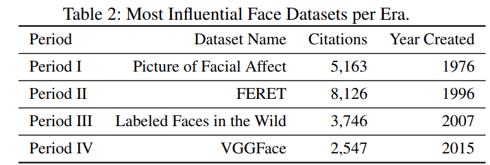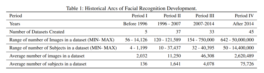 然后,團隊對這些當前可訪問的面部數(shù)據(jù)集進行了時間順序分析。表 1 給出了面部識別發(fā)展的每個階段的定量總結(jié),而表 2 展示了每個時代最具影響力的面部數(shù)據(jù)集。