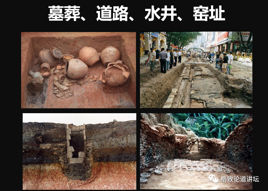 考古會發(fā)掘很多的遺跡現(xiàn)象,比如左上角的墓葬,右上角道路,還有一些水井,左下角的窯址。