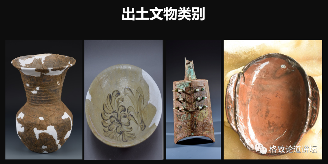 出土的文物類別也非常豐富,比如左邊第一個是陶器,第二個是瓷器,第三個是青銅器、鐵器,然后是漆木器。