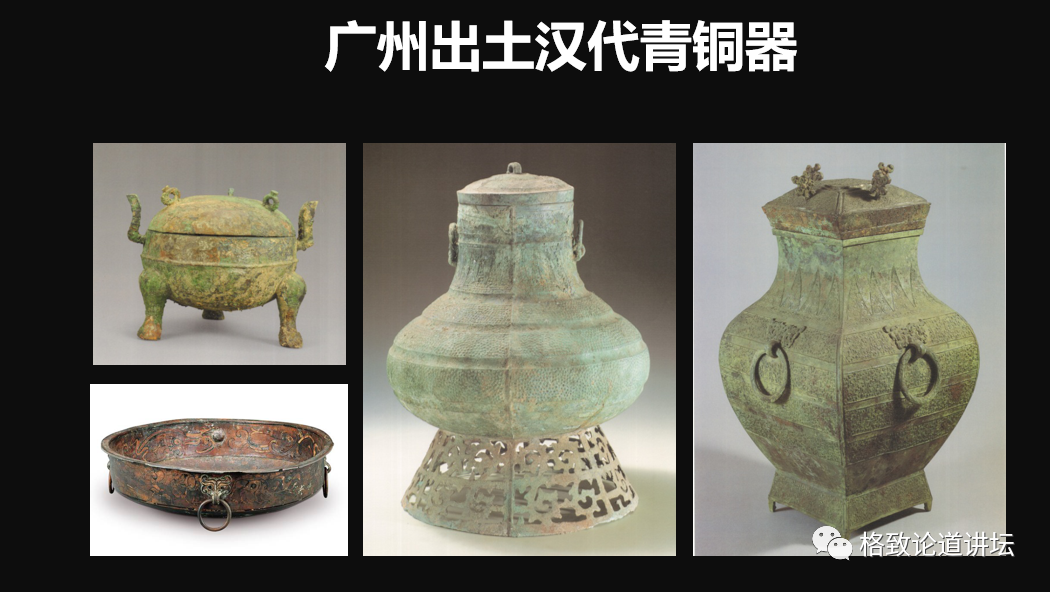 廣州出土最多的青銅器是我們南越王墓,廣州出土漢代青銅器主要器型有,像左上角的銅鼎,左下角的一件銅洗,中間是銅壺和銅鈁,然后還有一些環(huán)首刀、提梁壺和銅鏡等。