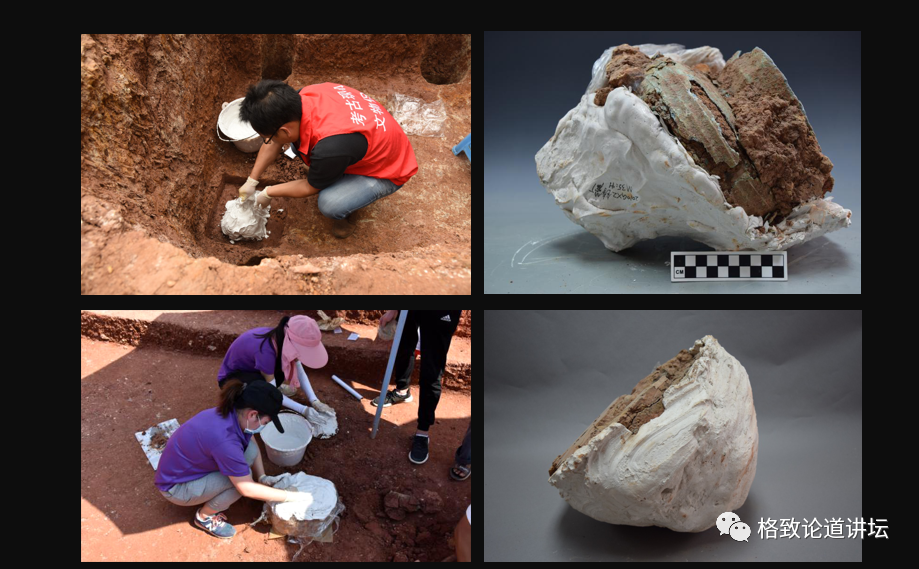 我們根據(jù)文物出土情況,一般采用比較多的就是石膏打包,左邊兩張是我們工作照,右邊兩張是我們發(fā)掘出土很多青銅器。