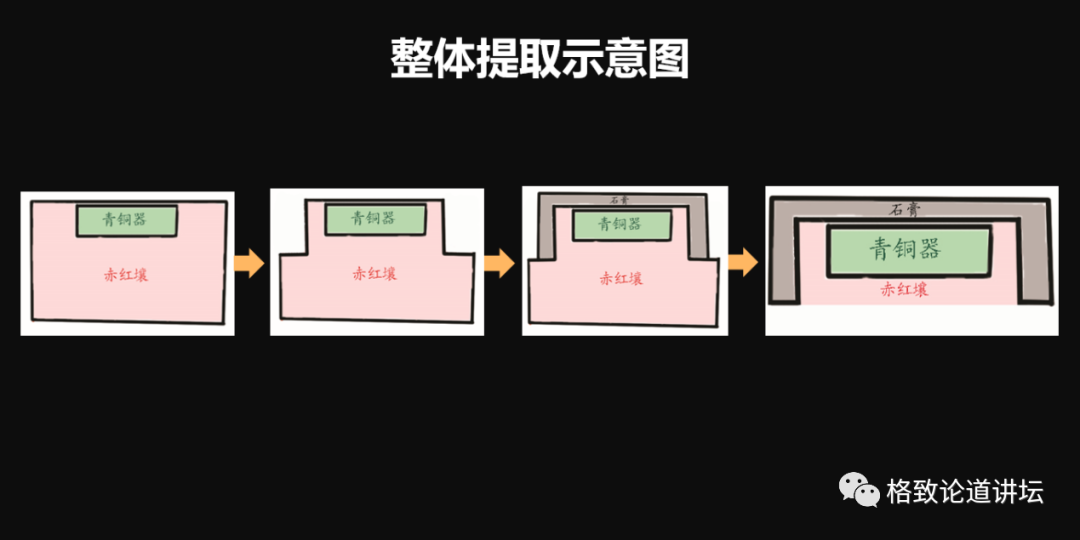 這是考古現(xiàn)場整體提取的一個示意圖,綠色是青銅器,我們在青銅器分布的土臺切割出來,上面鋪一層石膏,等石膏硬化后,再從下面切下去,用石膏撐出脆弱的青銅器,就可以提取到室內(nèi)了。