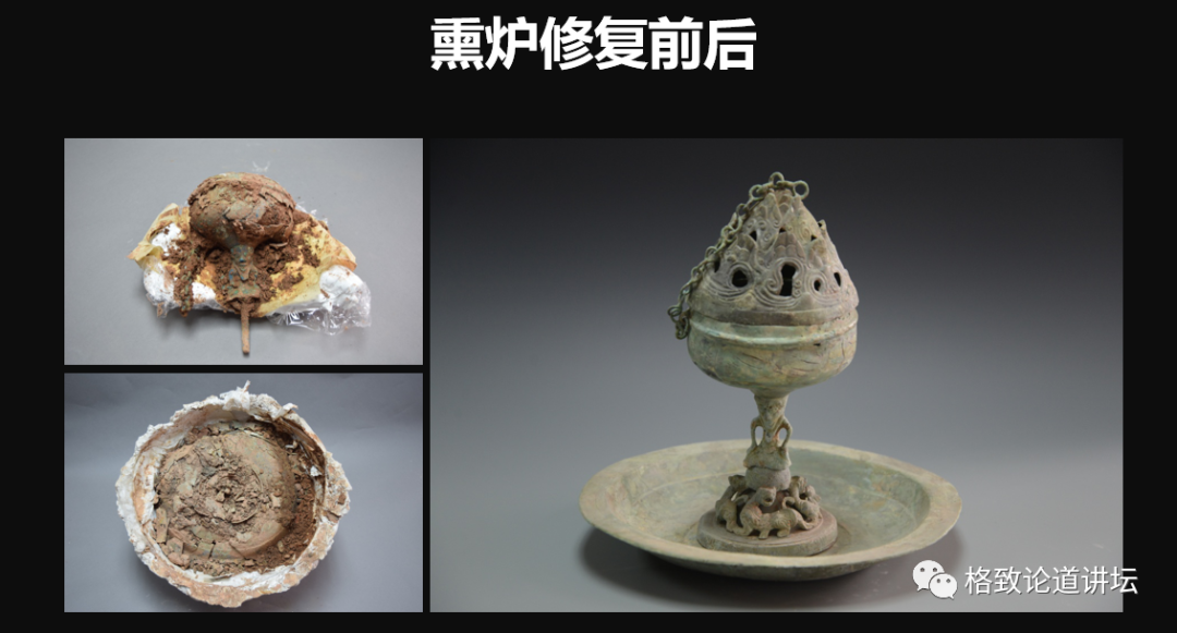 經(jīng)過我們清洗、去銹、粘接、拼對、加固,對殘缺位置進行補全,最后再做一些緩蝕封護之后,就是大家看到的左下角照片,修復(fù)之后的樣子。