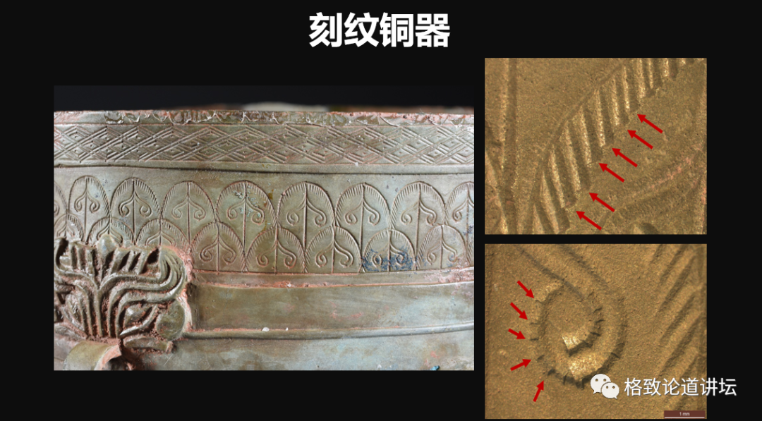 我們曾遇到一件溫酒樽,它表面有很多紋飾,我們通過放大鏡去觀看,就是右邊這兩個顯微鏡下的照片,紅色箭頭位置是刻刀下去、出來。
