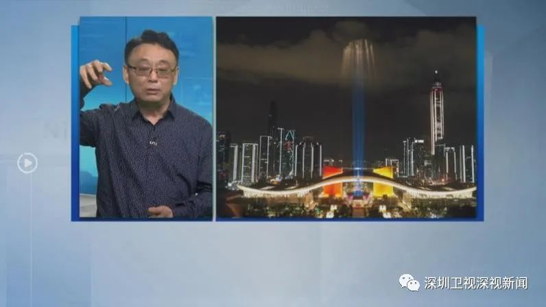 “我們就提出了N種方案,用燈光把黨徽打在天空中,把深圳整體的亮燈串到一起做一套主線。在蓮花山頂、在市民中心、在羅湖三個地方,做了三個巨型的大型柱體,最后是三個柱體合成打到天空以后,可以打到千米高度,黨徽就在深圳的上空,照耀著整個城市的人民?!?/p>