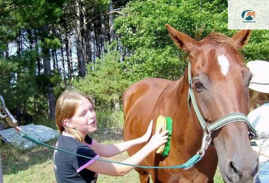 接觸和撫摸時(shí),切不可直接接觸馬的敏感部位,以防馬匹做出逃避或者反抗的行為,避免受傷。操作中總是從非敏感部位逐漸深入,從頸部到肩部再到腹部四肢,使馬匹有適應(yīng)的準(zhǔn)備。接觸敏感部位不能粗暴或傷害,應(yīng)耐心調(diào)教,以防形成惡癖。部分馬是拒絕觸摸四肢、腹部及耳部,對(duì)于日常調(diào)教用具及護(hù)蹄是不配合的,大多數(shù)是由人的處理不當(dāng)所造成的。所以,在獸醫(yī)人員治療或裝蹄時(shí),為了分散馬的注意力而使用保定措施。