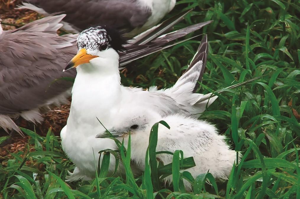 除此之外,它還有3個(gè)特別有趣的故事。一是沒(méi)有專(zhuān)屬繁殖地,常“混”在數(shù)千只大鳳頭燕鷗中產(chǎn)卵,奇妙的是,兩者繁殖時(shí)間基本同步。二是夫妻齊心“育兒”,從搭建巢穴、孵化鳥(niǎo)蛋到喂養(yǎng)雛鳥(niǎo),夫妻全程攜手,既有合作又有分工。三是組建臨時(shí)“幼兒園”,喂雛期間,父母外出捕魚(yú)時(shí),把雛鳥(niǎo)聚在一起,安排一只成鳥(niǎo)留守看護(hù),一直持續(xù)到雛鳥(niǎo)羽毛豐滿(mǎn)、能獨(dú)立生活。